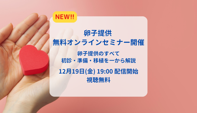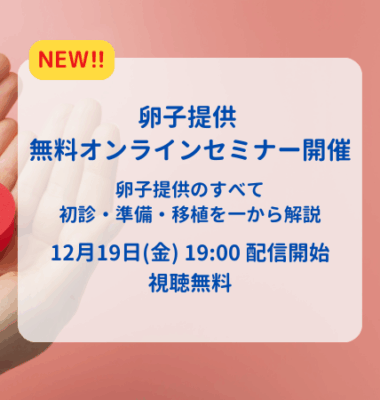 - 卵子提供に関心のある方へ|動画視聴お申し込みのご案内当院では、不妊で悩まれる方にはまず正しい知識を得ていただき、治療について今後のご判断をいただけたらと考えています。そこで、卵子提供をご検討中の方、卵子提供に関心のある方へ向けた動画をご用意しております