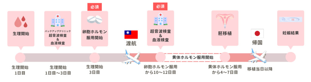 ・「E2」「P4」の数値を測定し、不正出血ではなく生理初期の数値であること、そしてE2、P4の値から自己排卵の可能性がないことをバックアップクリニックの医師とご確認ください。